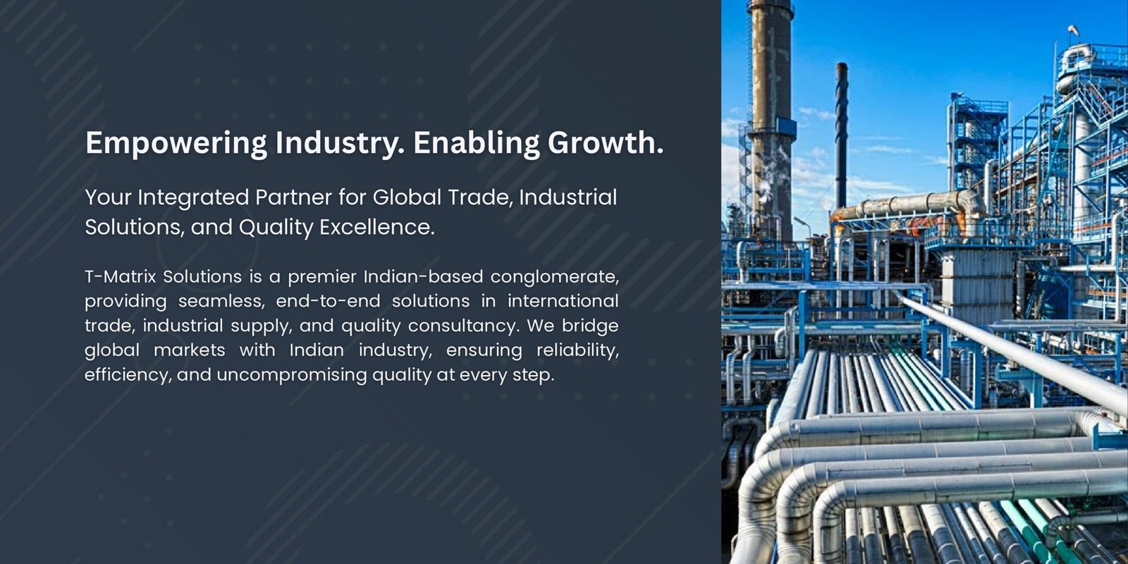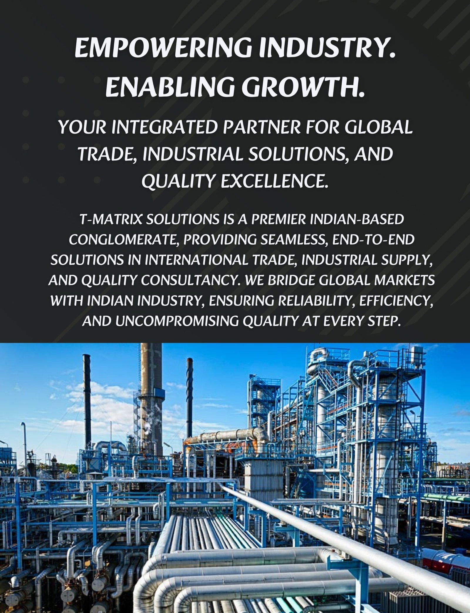 T-Matrix Solutions (INDIA) is a multi-disciplinary industrial and global trade solutions provider, headquartered in India with a worldwide reach. We offer integrated services in Import & Export, Industrial Supplies, Inspection & Testing Equipment, Machine Manufacturing, Chemical Supply, and Quality Management Consultancy including ISO and API certifications.